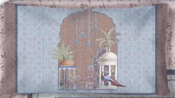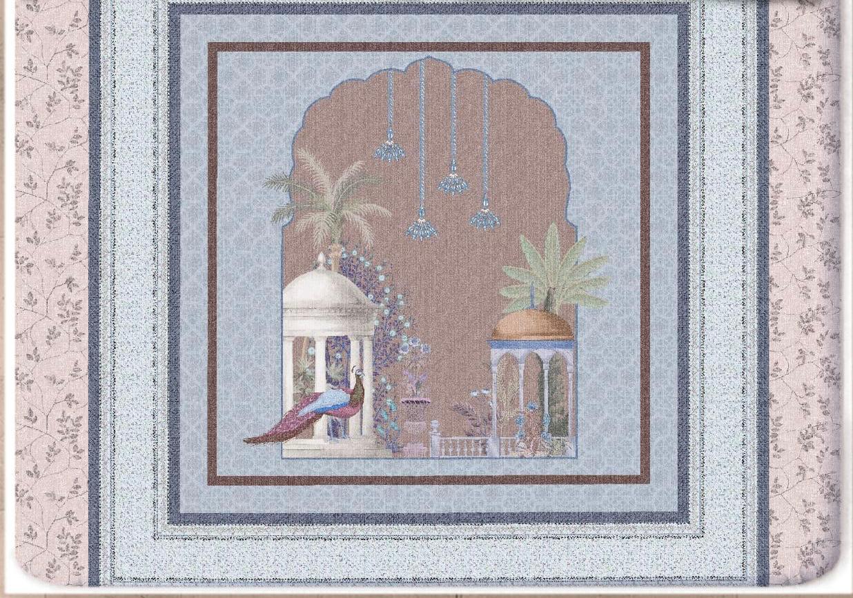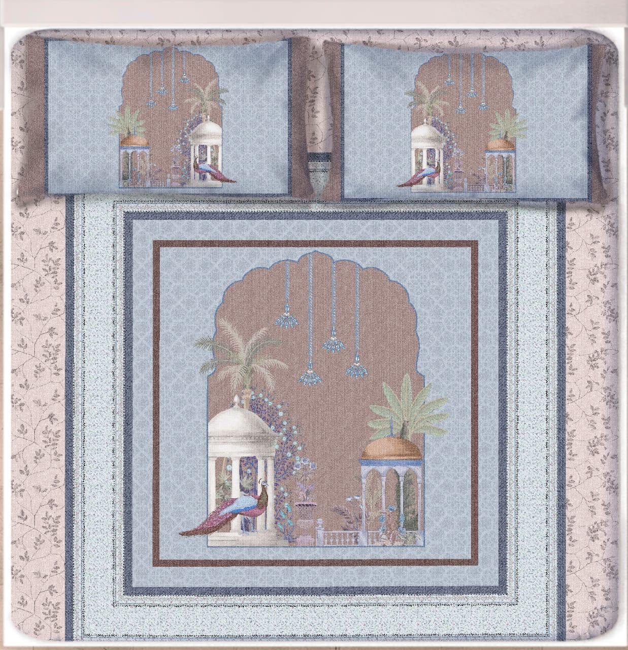 Step into royalty with this enchanting peacock and palace arch motif bedsheet. The serene powder blue base is adorned with regal domes, palm trees, and chandelier accents, creating a luxurious ambiance reminiscent of royal palaces. The central artwork highlights a majestic peacock perched gracefully, symbolizing beauty, elegance, and prosperity.