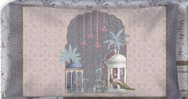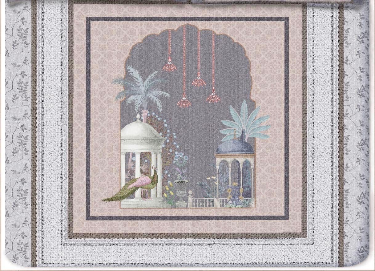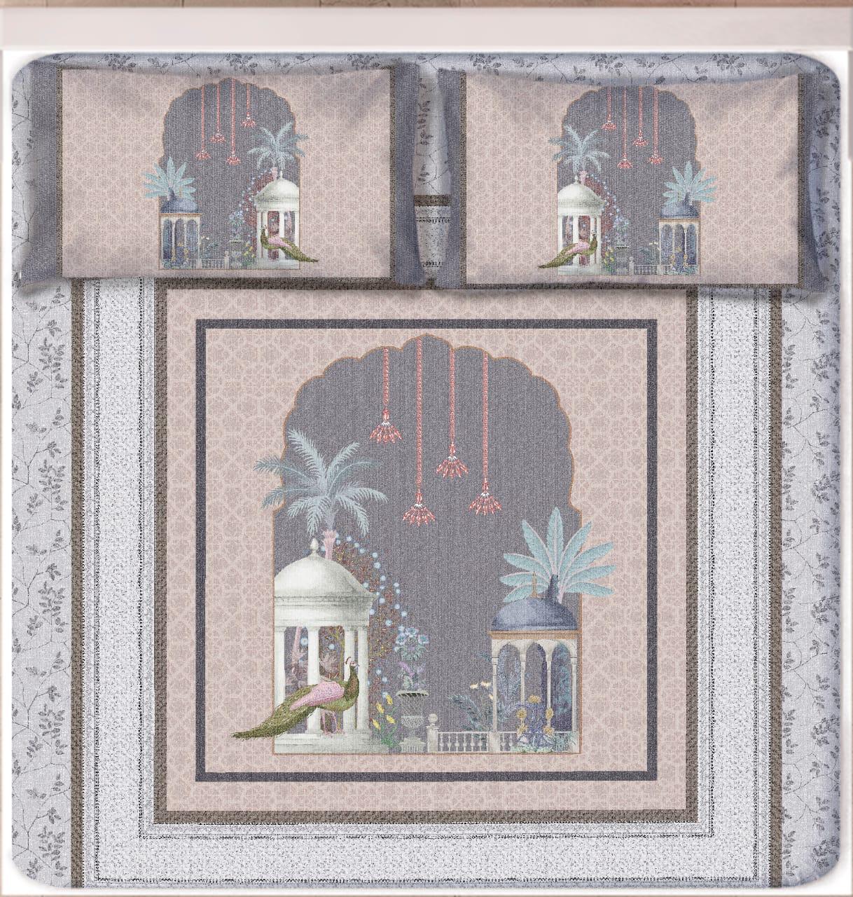 Experience regal charm with this luxurious bedsheet featuring an exquisite peacock perched on palace arches, surrounded by delicate palm trees and chandelier motifs. The soothing powder blue and beige palette adds a serene elegance, while the satin-cotton blend fabric ensures unmatched comfort.