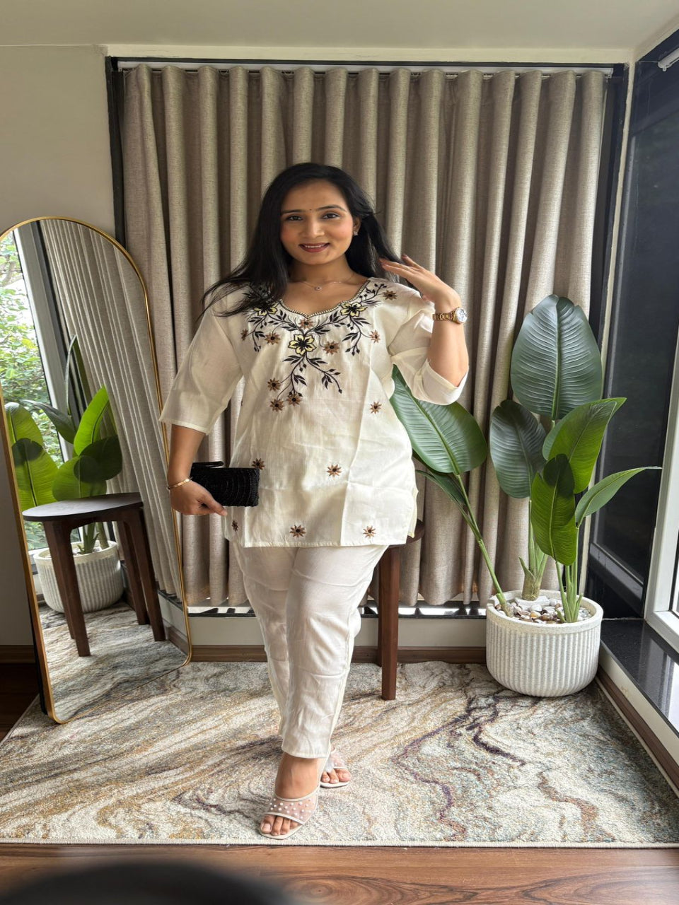 Redefine grace with this exquisite Silk Corde kurta set, blending luxury and comfort effortlessly. Designed in a soothing ivory-white tone, the kurta is adorned with delicate floral embroidery in black and yellow hues, giving it a refined ethnic charm. Paired with matching straight-fit pants, this set is perfect for both festive and semi-formal occasions.