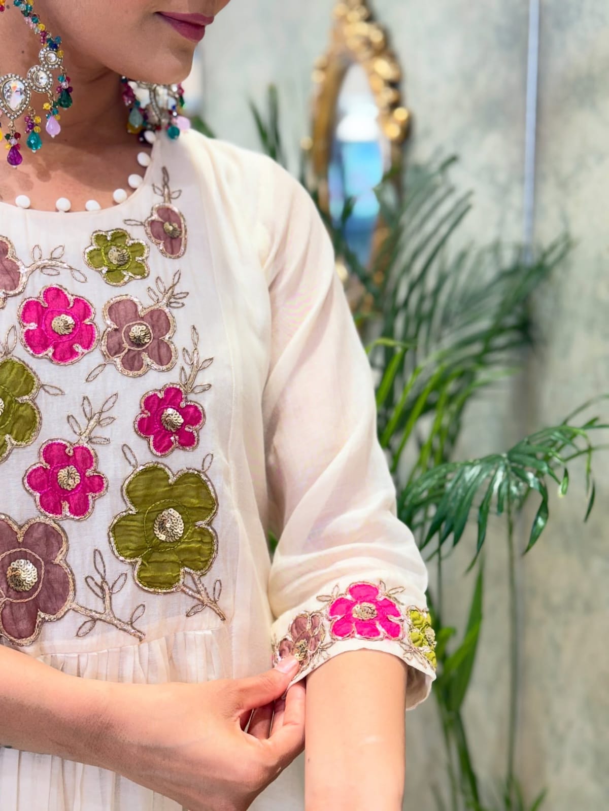 Elegant White Cotton Kurta Set with Floral Embroidery with Chanderi Dupatta