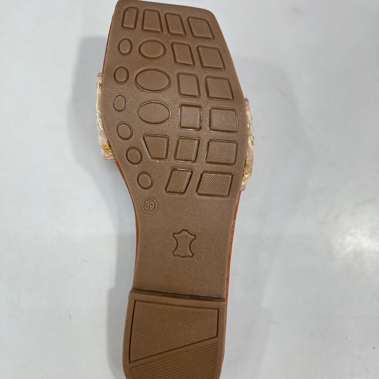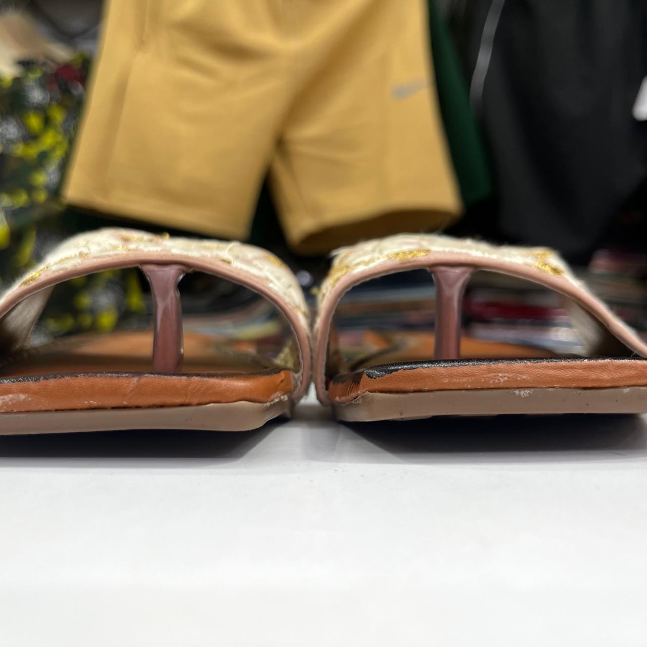 Elevate your festive and casual looks with these elegant blush pink slip-on flats. The wide strap is beautifully designed with intricate white floral embroidery highlighted with golden threadwork and sequins, creating a delicate yet luxurious appeal. Featuring a cushioned brown footbed and a stylish square-toe design, these flats ensure all-day comfort while adding a graceful touch to your ethnic and Indo-western outfits. Perfect for weddings, festive celebrations, and everyday elegance.