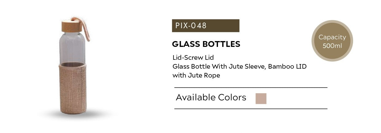 The PIX-048 Glass Bottle is designed for those who prefer natural, eco-friendly hydration. Made from high-quality glass, it features a protective jute sleeve for improved grip and insulation, along with a stylish bamboo screw lid and jute rope for easy carrying. Its minimal, earthy design offers ample space for branding, making it an excellent choice for corporate gifting, wellness kits, and sustainable promotions.