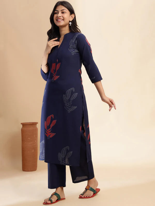 Upgrade your daily ethnic style with this elegant Navy Blue Leaf Print Straight Kurta Set. Crafted from soft, breathable cotton, this set keeps you comfortable throughout the day while offering a polished, graceful look.