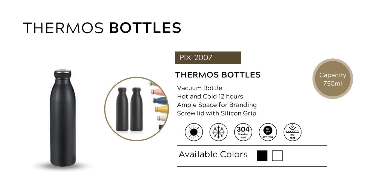 The PIX-2007 Vacuum Thermos Bottle is designed for a sleek look and reliable performance. Made from SUS 304 food-grade stainless steel, it features double-wall vacuum insulation that keeps beverages hot or cold for up to 12 hours. The screw lid with silicone grip offers a secure, comfortable hold, while the smooth body provides ample space for custom branding, making it ideal for everyday use and corporate gifting.