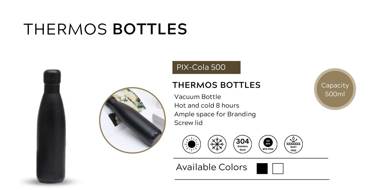 Stay refreshed all day with the PIX-Cola 500 Thermos Bottle, designed for both hot and cold beverages. Crafted with high-quality 304 stainless steel, this vacuum insulated bottle keeps drinks hot or cold for up to 8 hours. Its sleek matte finish offers ample space for custom branding, making it perfect for corporate gifting or everyday use. The secure screw lid ensures leak-free portability, while the BPA-free and rust-free construction guarantees safe, long-lasting performance.